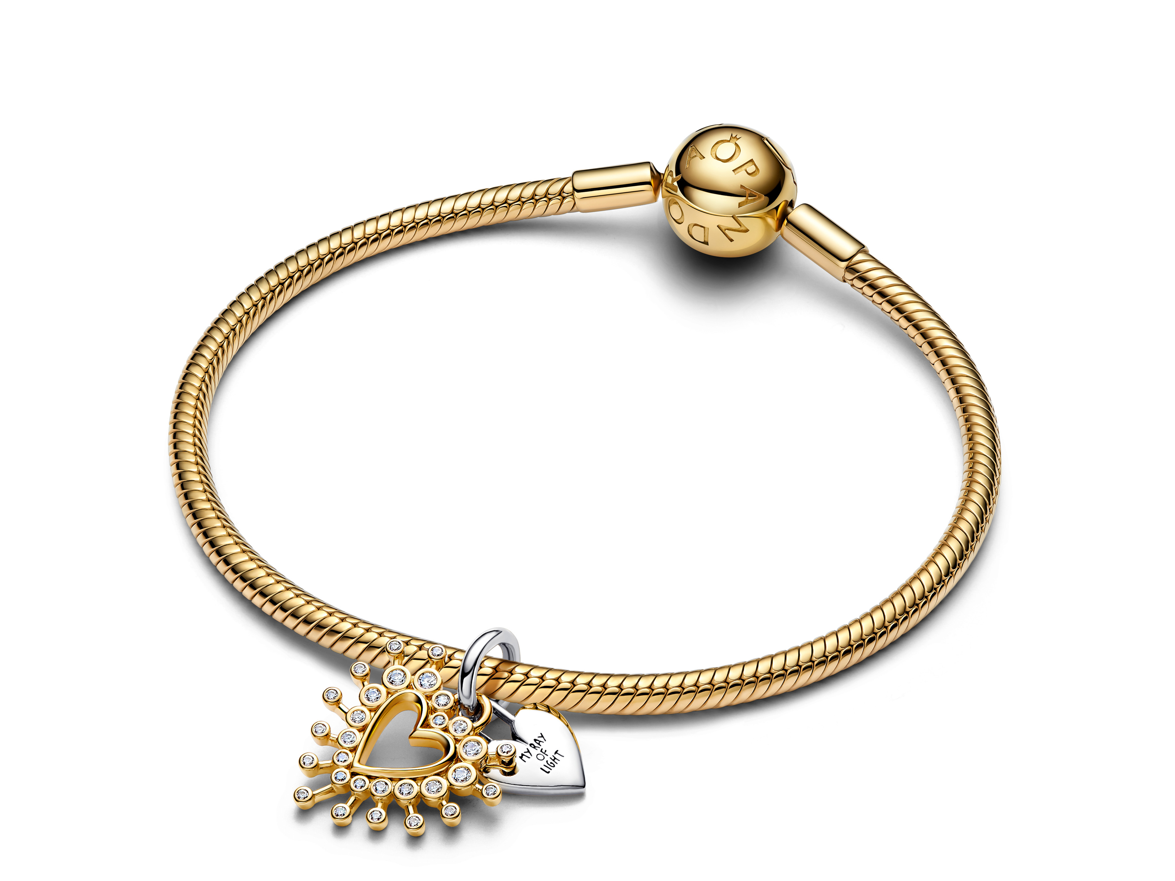 Bringe mit diesem Bicolor Charm-Anhänger deinen Look zum Strahlen. Das Design hat ein offen gearbeitetes Herz, das von Strahlen umgeben ist, und eines mit der verborgenen Gravur - MY RAY OF LIGHT - Behalten. Teilen. Gemeinsam glänzen.