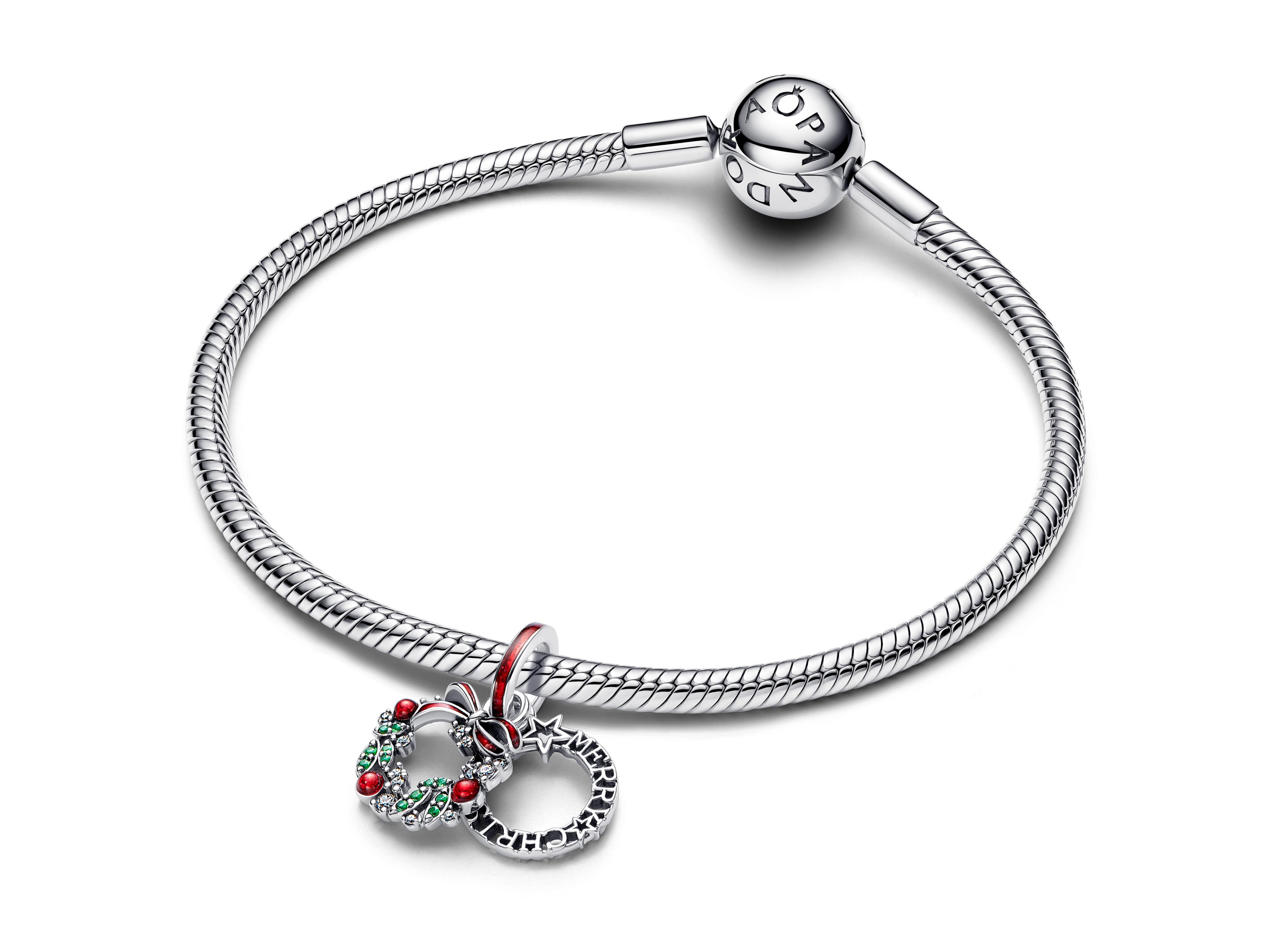 Original Pandora 794238C01 - Weihnachtskranz Doppelter Charm-Anhänger - Sterling Silber - Emaille Steinmix Rot